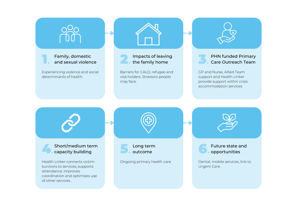 Over a two-year pilot, Connect Well brings primary health care into crisis accommodation, making it easier for victim-survivors to access ongoing, integrated support. The crisis accommodation services that the Connect Well program will be delivered in are: